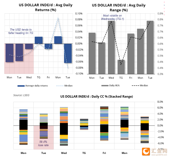 感恩节周期美元走势规律凸显:回溯1985年以来的历史数据,美元指数在假期前三个交易日(周一、周二、周三)平均回报率均为负值,上涨概率均不足50%,其中周二下跌概率高达59.4%。